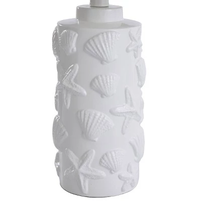 Highlight your space with the Seashell Motif Table Lamp in White with Hardback Fabric Shade from the Signature Collection by StyleCraft Home Collection. Featuring seashells and starfish, this hand-carved accent lamp is perfect for any beach lover. The hardback fabric shade comes in white to match the white poly body. No matter how far away you live from the ocean, this lamp makes for the perfect addition in your living room. This will pair well with nautical styling and is sure to be a conversation piece.