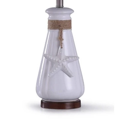 Accent your home décor with this Serenity Seaside Ceramic table lamp from the Signature Collection by StyleCraft Home Collection. The Starfish table lamp brings coastal style and attractive accents to offices, dining rooms and foyers. Made of polyresin and ceramic, the lamp features a beautiful white finish and a charming starfish pendant that attaches to a small rope tie. The soft shade consists of rayon and polyester, neatly accenting the frame. It will pair well with coastal styling. Regardless if you put it in the bedroom or family room, this table lamp stands out. Suitable for residential use in a dry location. This modern table lamp is UL listed in compliance with the nationally recognized safety standards.