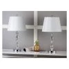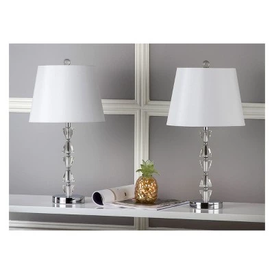 Illuminate your space with the contemporary design of the Deco Prisms Crystal Lamp Set from Safavieh. The chic lamps each feature a durable crystal base with a stacked prism design and a sleek clear finish. The white canvas lamp shades on the stunning lamps subdue light so it doesn’t overpower your space, whether it’s a small den or large living room. The lamps can use up to a maximum 60 Watt lightbulbs. Not compliant with California Title 20.