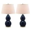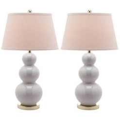 Refresh your living room, bedroom, or den with the classic elegance of the Jill double gourd ceramic lamp. Shown in bold colors with brass stand and fittings, this gracefully curved lamp is paired with gold-rimmed cotton shade for a soft transitional look. The Jill Double Gourd Ceramic Lamp Set by Safavieh is available in a variety of colors to best suit your personal tastes and decor. It has a rotary switch, a E26 bulb base type, and is sold in a set of 2.