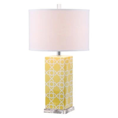 Bring a burst of color and pattern into neutral rooms with the Quatrefoil table lamp by Safavieh. Crafted of navy and white ceramic with acrylic base and a silver neck, this Moroccan-patterned design is topped with a contemporary off-white cotton drum shade. The Quatrefoil table lamps by Safavieh is available in a variety of colors to best suit your personal tastes and decor. It has a rotary switch, a E26 bulb base type, and is sold in a set of 2.