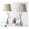Inspired by the rustic décors of chalets in the French Alps, this antler table lamp is a contemporary collector’s item. Its sculpted antler in a dramatic silver finish sits atop a luxurious glass base, creating an artistic statement in any living room. Its glass and crystal construction displays an air of contemporary style and illuminates the room in a cool manner. This table lamp by Safavieh contains two LED 9W bulbs requiring an E26 Screw Terminal base. It has a rotary on / off switch.