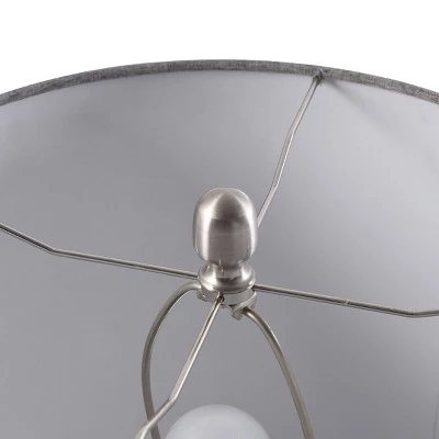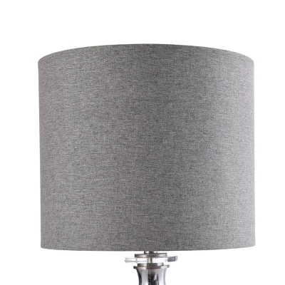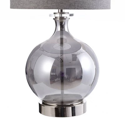 Sure to stand out in any room with contemporary décor, the Saco table lamp has a gleaming steel base, a smoked glass globe frame, acrylic accents, and a gray linen drum shade. The acrylic disc cap at the top of the glass frame matches the circular finial. Upgrade a living room or family room side table with this exquisite gray smoked glass lamp. This piece exemplifies superior product design and great styling. It will pair well with contemporary styling. Suitable for residential use in a dry location.