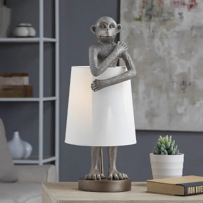 Featuring an antique brass finish, the charming Ravena table lamp looks like a standing monkey holding a white “towel” shade. The light blue and silver undertones of the frame’s brass finish ensure this lamp will blend into the decor of any living room or family room. The charming look of this animal table lamp is sure to elicit smiles. This piece exemplifies superior product design and great styling. Suitable for residential use in a dry location.
