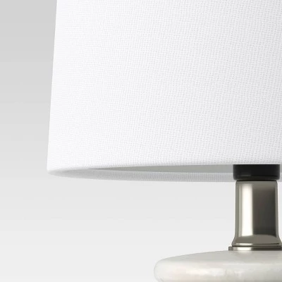 Illuminate your favorite reading nook or bedside table with this gorgeous Textural Ceramic Mini Lamp from Threshold™. This ceramic mini table lamp makes a welcome addition to your indoor lighting. It features a curved base with a colorblock pattern for sophisticated, chic flair. The white drum shade diffuses light for a soft, ambient glow, while the one-way light setting allows for easy operation. Place it on the side table next to your sofa or on a console table in your living room for an inviting look.