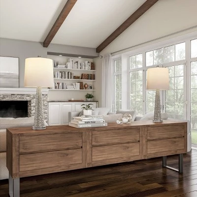 This set of Slim Hammered Style Glass LED Lamps from Hastings Home illuminates your space while adding a touch of elegance to your home. Designed with a slim tall cone shaped body of glass with hammered style texture in metallic brushed silver finish, these beautiful lamps are paired with ivory drum shaped fabric shades for a blend of modern touch of vintage glam style perfect for your living room, entryway, bedroom, or office. Each lamp comes with an energy-efficient 9W 805 lumens LED bulb that will brighten your room for 25,000 hours before needing to be replaced.