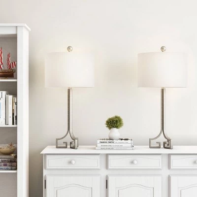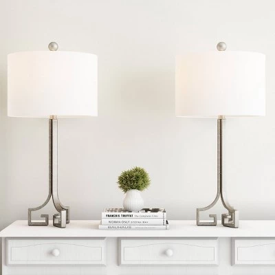 This set of 2 Greek Key Table Lamps from Hastings Home illuminates your space while adding a touch of elegance to your home. Designed in an antique silver finish with a slim silhouette and an intricate tripod Greek key at the base, these beautiful lamps are paired with ivory drum shaped fabric shades for a modern style that’s perfect for your living room, entryway, bedroom, or office. Each lamp comes with an energy-efficient 9W 805 lumens LED bulb that will brighten your room for 25,000 hours before needing to be replaced.