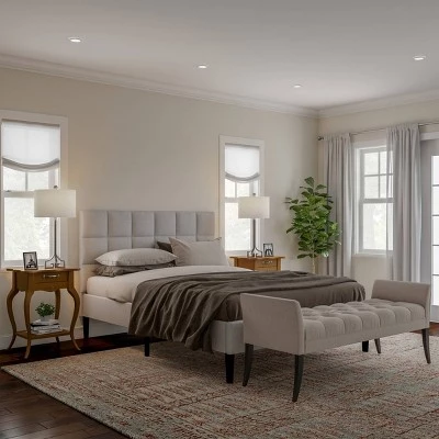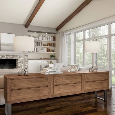 - The table lamps are topped off with soft ivory drum shaped fabric shades for a modern style