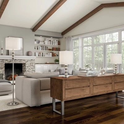 This 3-piece set of Stack Ball Lamps from Hastings Home illuminates your space while adding a touch of elegance to your home. Constructed of brushed silver metal, the stacked sphere-shaped bases are paired with ivory linen drum shaped fabric shades for a contemporary style perfect for your living room, entryway, bedroom, or office. Each of the two table lamps and one floor lamp comes with an energy-efficient 9W 805 lumens LED bulb that will brighten your room for 25,000 hours before needing to be replaced.