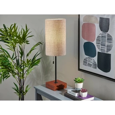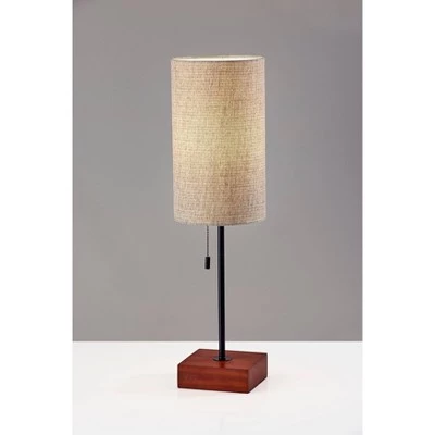 Illuminate your space in a stylish blend of neutral colors with the 26.75″ tall Trudy table lamp. This modern lamp artfully mixes materials and shapes, with a cube-shaped base in a warm walnut finish, a thin black stem, and tall drum-shaped shade. The beige and brown textured fabric shade softly distills light from the 60W bulb (not included). Operated by a black metal pull chain switch that matches the stem, the table lamp also features a 5′ brown cord. The Trudy table lamp is also available with a blue textured fabric shade or a mustard yellow textured fabric shade.