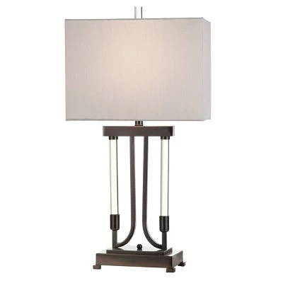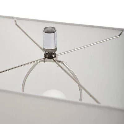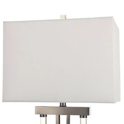 The Valerin table lamp exudes modern appeal with its white rectangular shade, footed base, and pewter frame with two crystal rods. The pewter finish on the base blends seamlessly with the frame, and there is a clear crystal finial. The three-way switch allows customized illumination in a family room or living room. This piece exemplifies superior product design and great styling. It will pair well with contemporary styling. Suitable for residential use in a dry location.