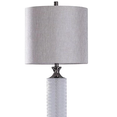 Accent your home décor with this Walsall Herringbone Glass Column table lamp from the Signature Collection by StyleCraft Home Collection. A striking transitional table lamp showcases an effective mix of materials. Using a herringbone glass body with a gorgeous steel base, the frame presents an appealing two-tone effect. The designer gray shade features a mix of rayon and polyester and adds an exquisite accent. This lamp brings overt glam style to modern dining rooms, living rooms and foyers. This piece exemplifies superior product design and great styling. It will pair well with glam and luxe styling. Regardless if you put it in the bedroom or family room, this table lamp stands out. Suitable for residential use in a dry location. This modern table lamp is UL listed in compliance with the nationally recognized safety standards.